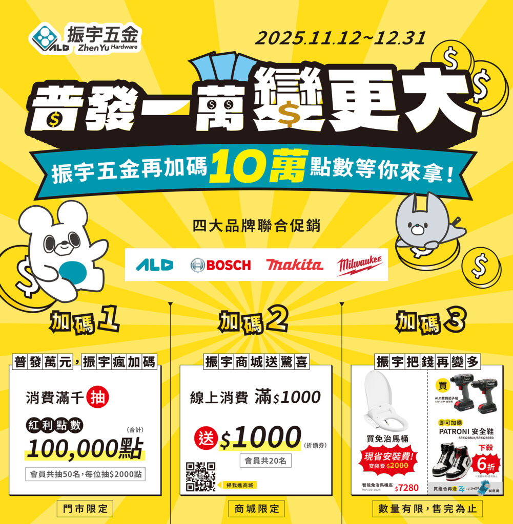 11/12 起到 12/31,振宇五金門市&ALD SHOP線上通路同步祭出三大加碼方案,點數、折價券、好禮一次帶回家!
