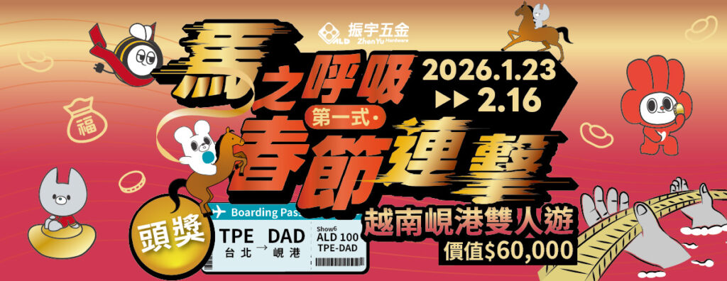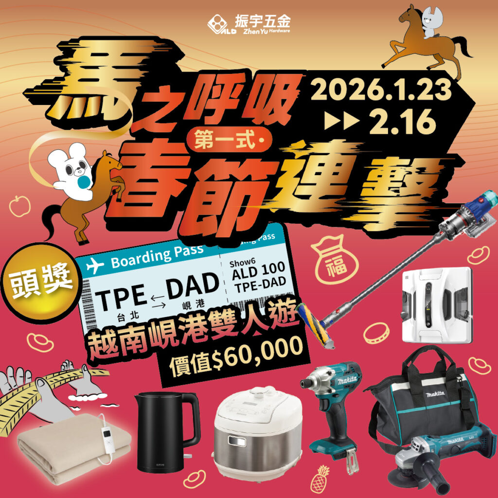 迎接新的一年,振宇五金推出 2026 新春檔期活動,從滿額抽獎、會員兌換、居家煥新優惠,到人氣商品與新品推薦,多項好康同步開跑。春節前來振宇,不只把家裡準備好,還有機會把越南峴港雙人五日遊帶回家!