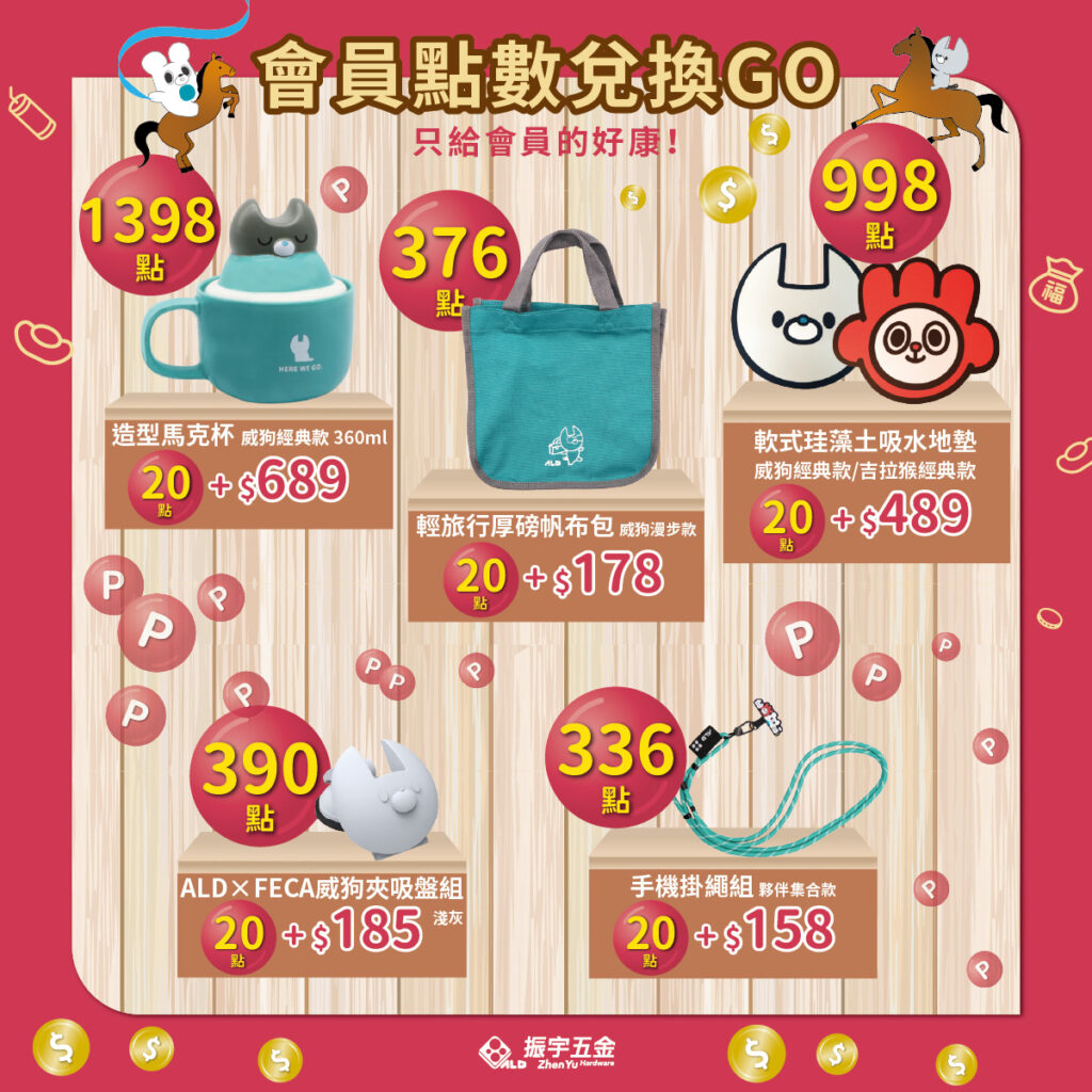 會員限定點數兌換活動同步開跑,多款振宇夥伴可愛又實用的週邊商品開放集點加價購,包含造型馬克杯、厚磅帆布包、威狗吸盤組、手機掛繩組、珪藻土地墊等,最低 $158 元即可輕鬆入手。