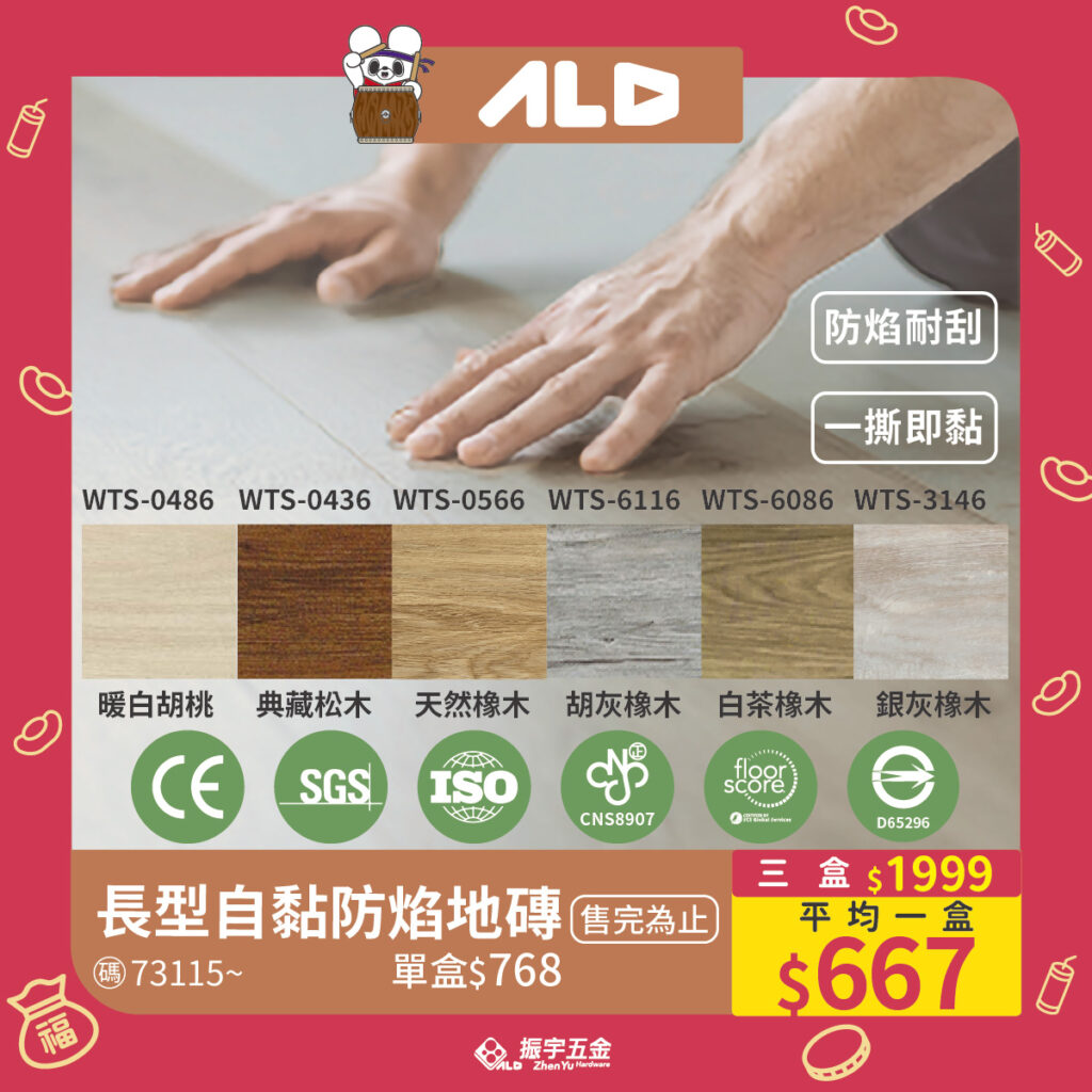 人氣 ALD 長型自黏防焰地磚推出三盒優惠價,2,000 元有找,一次省下 $300。六款質感木紋色系,一撕即黏,讓居家空間快速煥新,輕鬆打造溫暖居家氛圍🎀