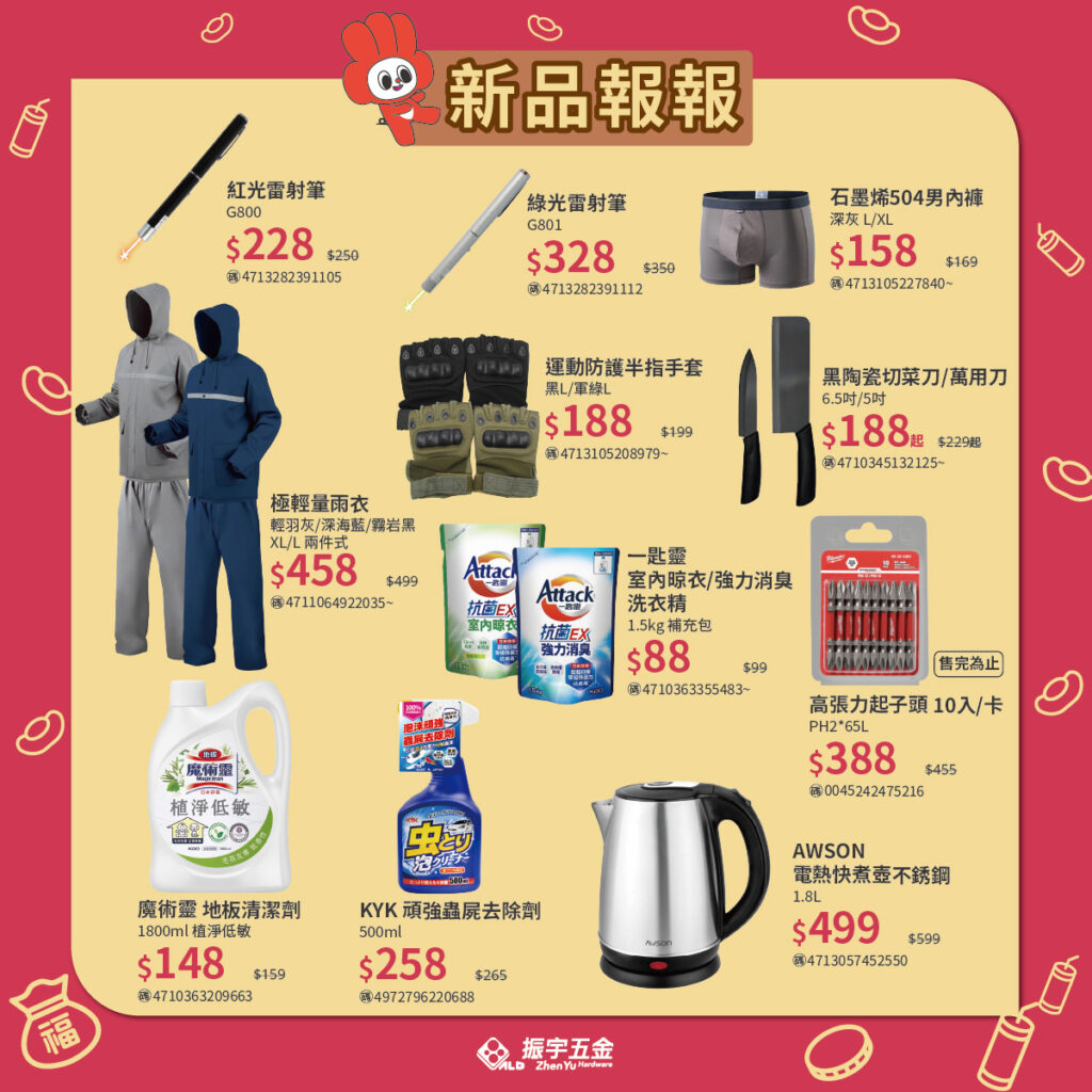 多款新品同步登場,包含雷射筆、男用內褲、極輕量兩件式雨衣、黑陶瓷菜刀、各式清潔劑、AWSON 電熱快煮壺與高張力起子頭組,新年換新品趁現在!