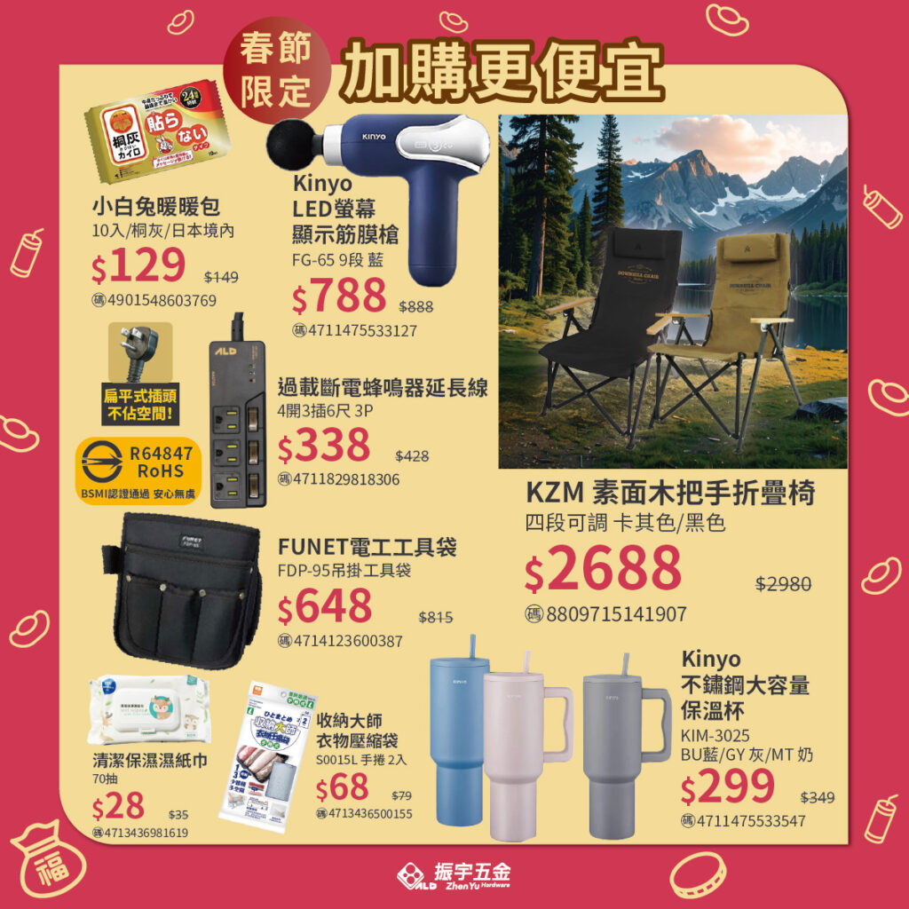 小白兔暖暖包、kinyo筋膜槍、斷電蜂鳴器延長線、KZM質感折疊椅、Kinyo不鏽鋼保溫杯、保濕濕紙巾,各項實用加購商品最低$28元起。
