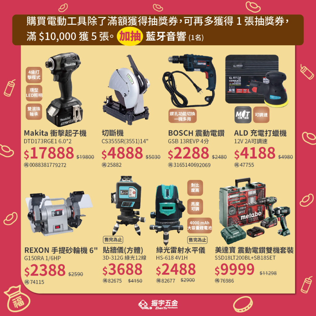 全館單筆消費滿 $588 即可獲得一張抽獎券,購買電動工具再加贈一張。單筆消費滿 $10,000 元,最高可獲得 5 張抽獎券,再加抽藍芽音響一名!