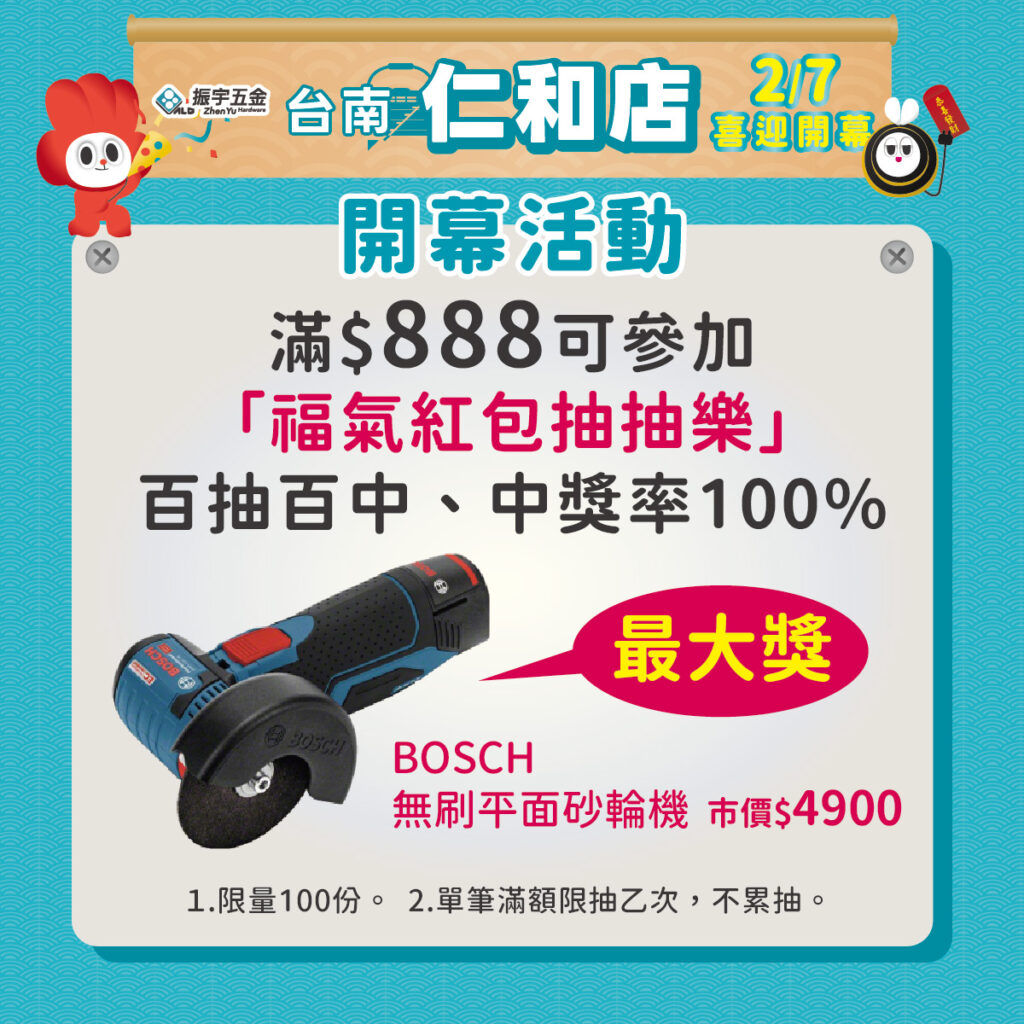 開幕當天單筆消費滿$888,即可參加「福氣紅包抽抽樂」,抽抽都有獎!