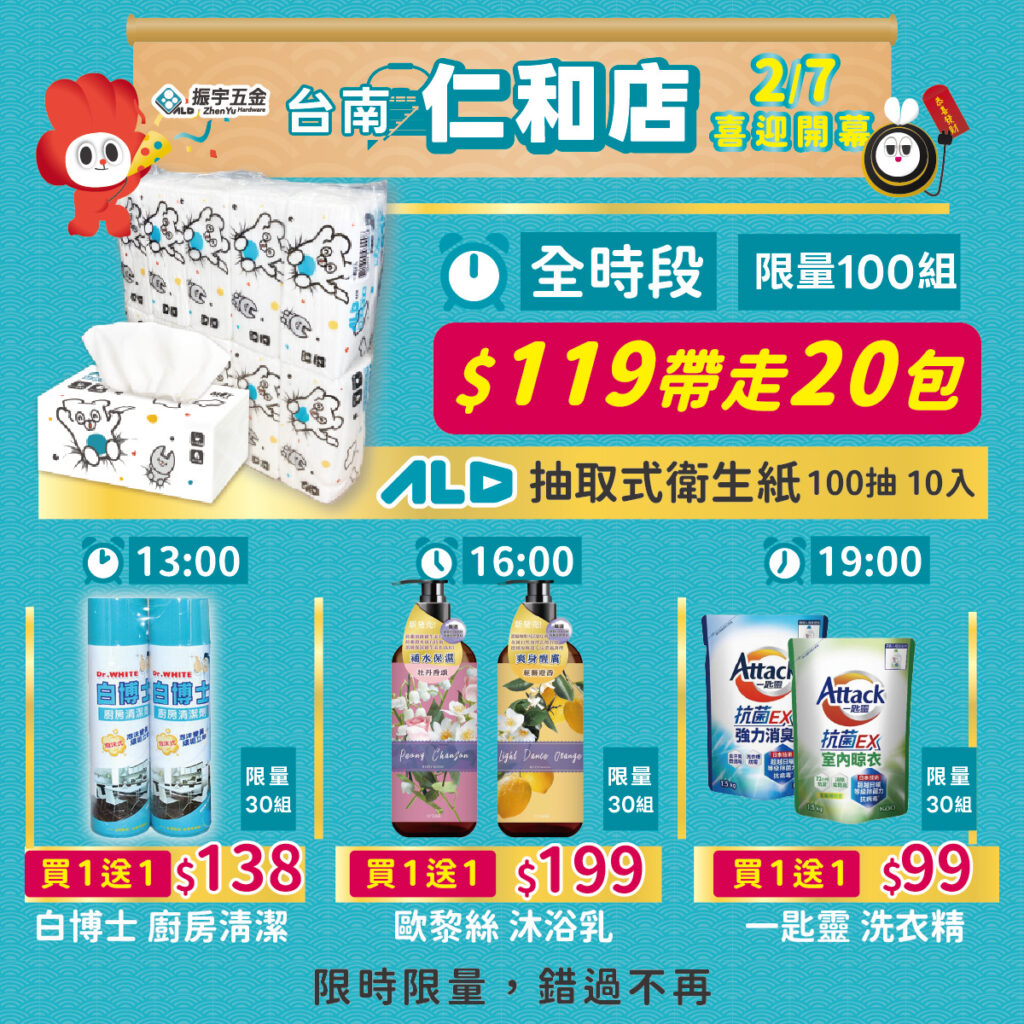★ 開幕當天到仁和店拍照,上傳FB並標註 「#振宇五金仁和店開幕」,即可獲得「ALD迷你濕紙巾」乙包,迷你尺寸隨身攜帶好方便~