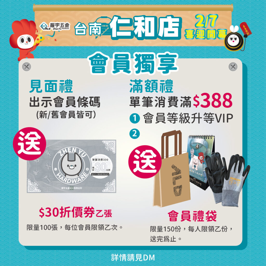 加入台南仁和店Line@ 並按讚追蹤振宇五金官方fb,現場再送百利手套一雙,