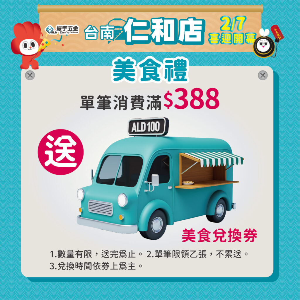 開幕當天單筆消費滿 $388,除了抽獎添好運,再贈美食兌換券一張,逛好康還能拿好吃美食!