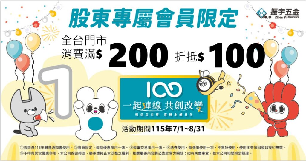 活動新訊 115年股東會限定優惠(7、8月) Posted on 2026-03-102026-04-23 by 鄭雅謙 10 3 月 振宇五金股東會限定優惠! 🎁 優惠限定期間,凡加入會員後,於全台門市單筆消費滿200元可折抵100元。 憑開會 閱讀更多