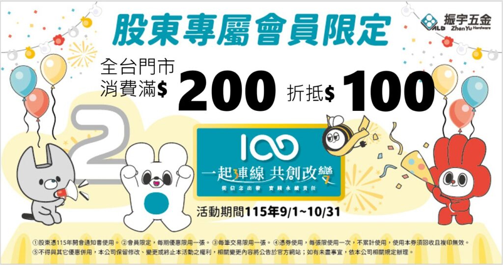 活動新訊 115年股東會限定優惠(9、10月) Posted on 2026-03-102026-04-23 by 鄭雅謙 10 3 月 振宇五金股東會限定優惠! 🎁 優惠限定期間,凡加入會員後,於全台門市單筆消費滿200元可折抵100元。 憑開會 閱讀更多