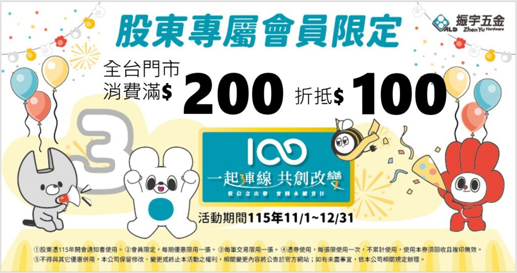 活動新訊 115年股東會限定優惠(11、12月) Posted on 2026-03-102026-04-23 by 鄭雅謙 10 3 月 振宇五金股東會限定優惠! 🎁 優惠限定期間,凡加入會員後,於全台門市單筆消費滿200元可折抵100元。 憑開會 閱讀更多